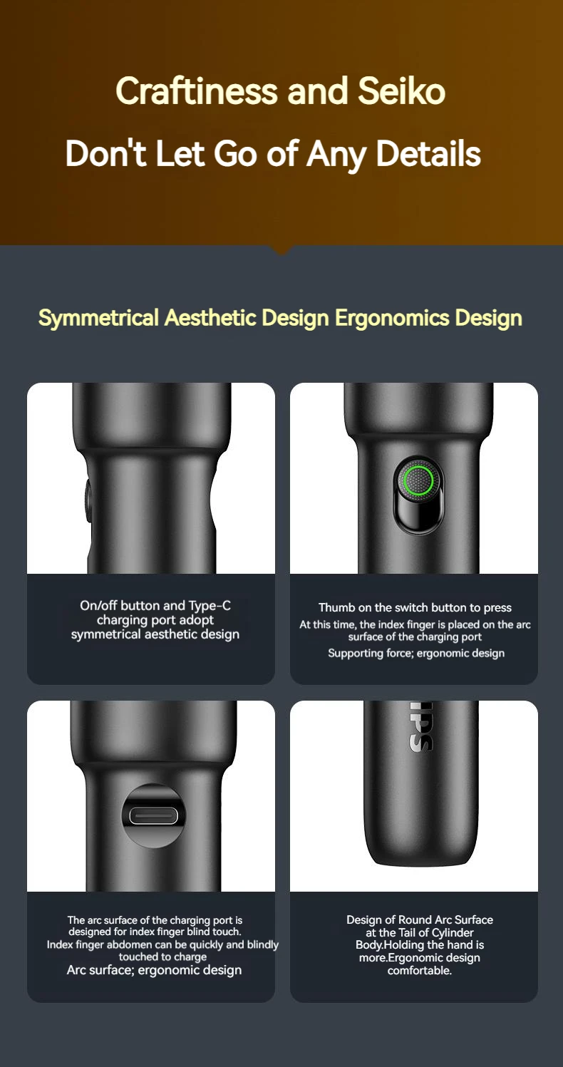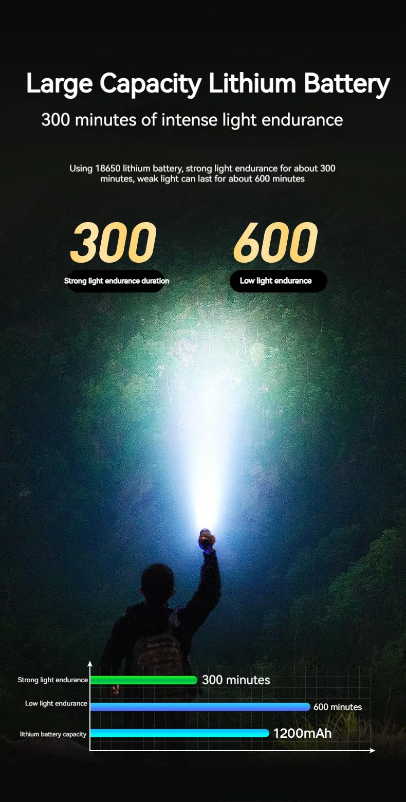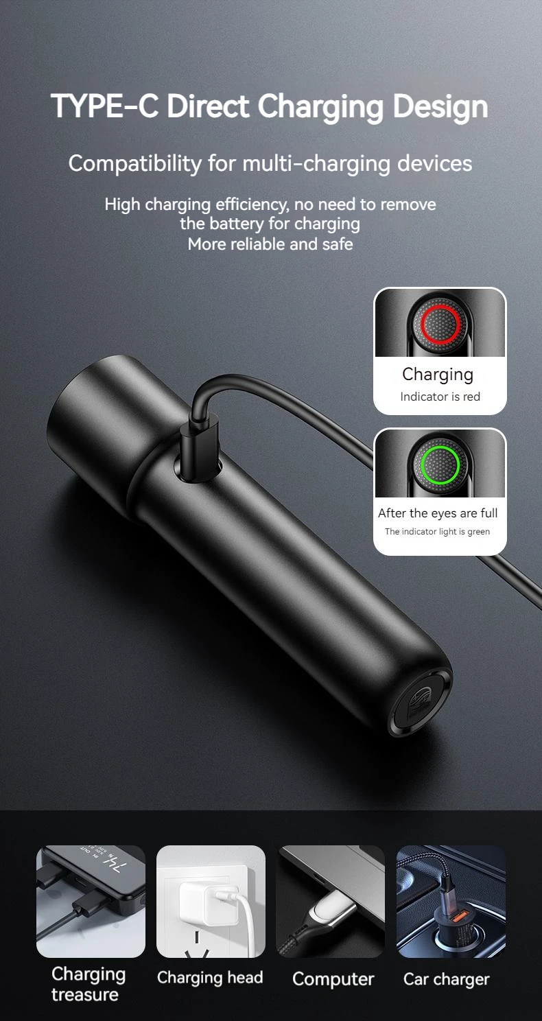 • Rechargeable :No need to constantly replace batteries. Simply recharge the flashlight using a USB cable.